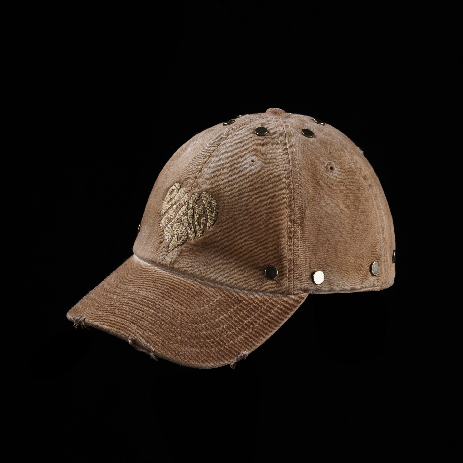 Finally, the brim of the cap also features distressing for an edgy finish.